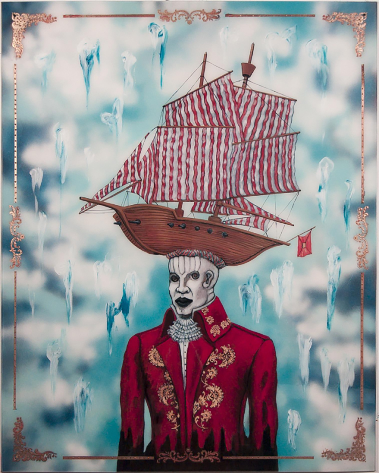 The stage is set with a room entitled the “Cabinet de Curiosites”, unique and precious objects collected by the artist in his travels that inform his work. Centering on the symbolic and cultural histories of Haiti and the Caribbean, Duval-Carrié’s artistic themes are variations on the historic life of the region. As he describes it, the Caribbean was a theatre for historical colonial encounter.