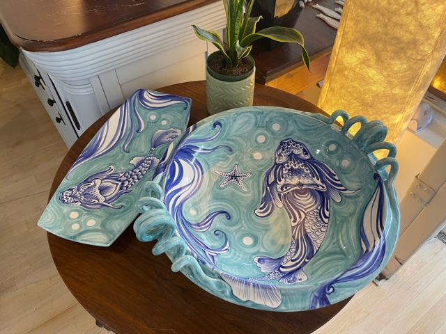 Prices for the ceramics range from $20 for an espresso cup to $700 for a handsome plate that doubles as a decorative piece and for serving. She also takes commissions. One couple walked in recently and asked her to create six bowls with olive designs. She has been doing personalized collectibles for the last year, in a wide range of different colors and forms, and her creations are in homes all around the United States.