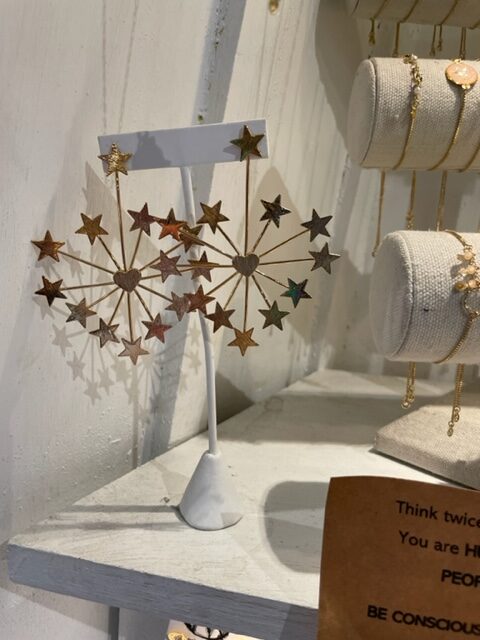 Well over a dozen designers are featured, items for men and women, ranging from men’s bathing suits made of recycled plastic fiber cord and tunics from India to maxi dresses, jeans,  sandals from Ghana, art,  and even watches and organic beauty products. In particular, what caught my eye were gold fashion starburst earrings from a local designer, Claudia’s jumpsuits and jean jackets, and wonderful long sleeve white T’shirts for men with a subtle pattern on one sleeve and  the front and back, and made from a light and airy Peruvian cotton (Mr. W scored one!). Everything is one of a kind and definitely unique. When you’re in Wynwood, it’s worth a visit. Wynwood Tribe, 2200 NW 2nd Avenue.